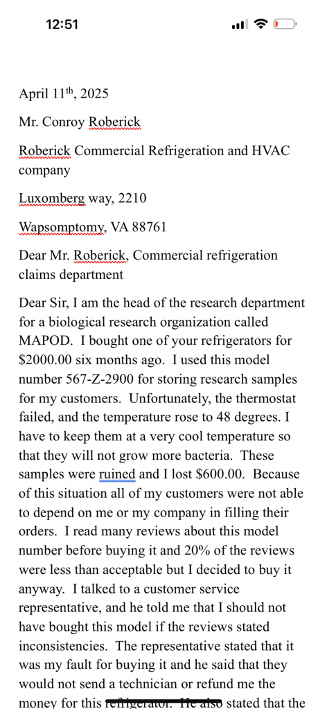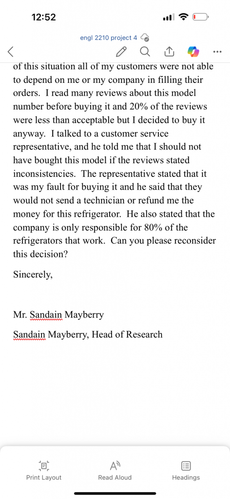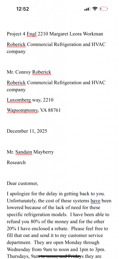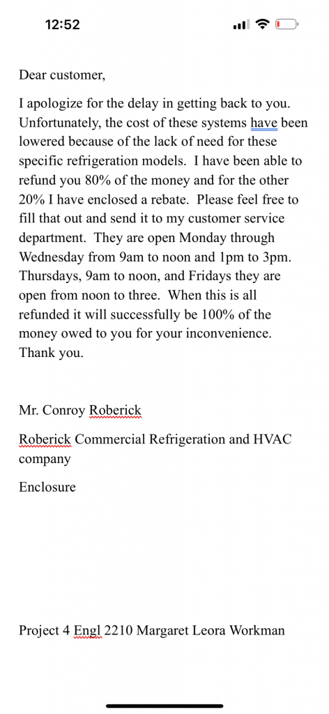 For this assignment we had to make up some of this situation. He wanted the response letter to be that the refund was given right away. I did follow his instructions for that but I added a rebate as well. Anyone remember those? Anyway, I have never really received a refund right away and sometimes I don’t receive a refund at all, even though it’s blatantly destroyed. For some reason he took off two points with no explanation as to why. we had to follow the guideline for writing this sort of letter from the book. These are just screen shots of my paper from my one drive.