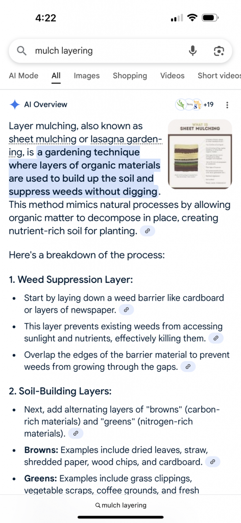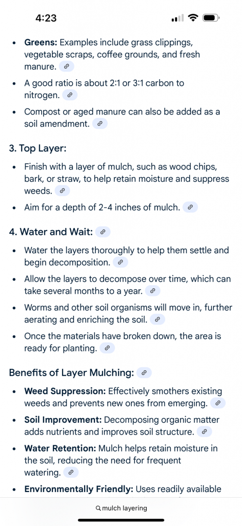 Here is what the AI overview has to say about it. I didn’t get all of the info. In these pictures. There are soooo many fun and informative videos on YouTube about this subject. Please look at those as well for more inspiration. You don’t need a very large space! Also, if you have a nice yard and you don’t want to ruin it, there are yard partitions that you can buy or build a small fence or get a fence panel from the hardware store to put your sheet mulching area behind. No one will ever know it’s there!
