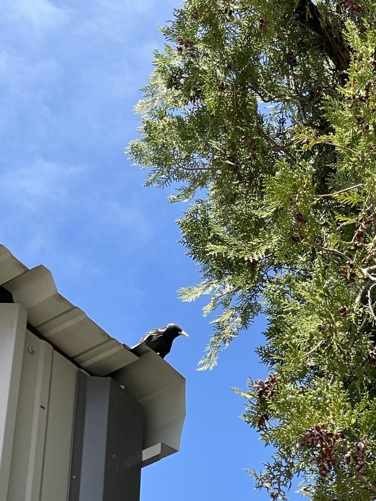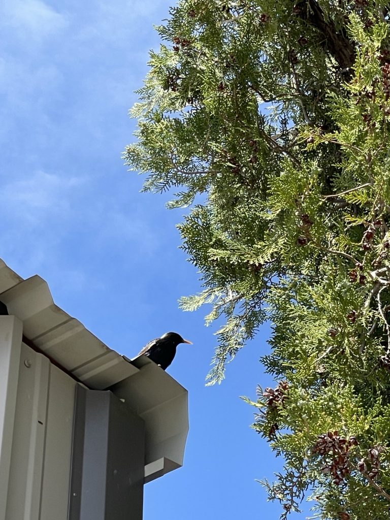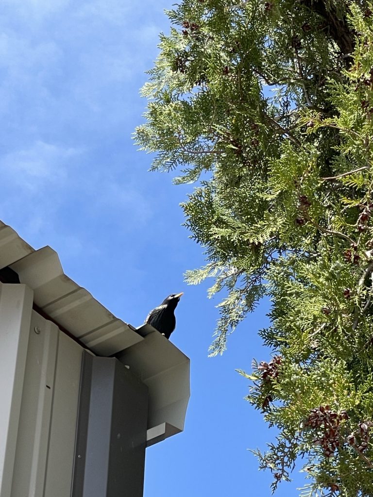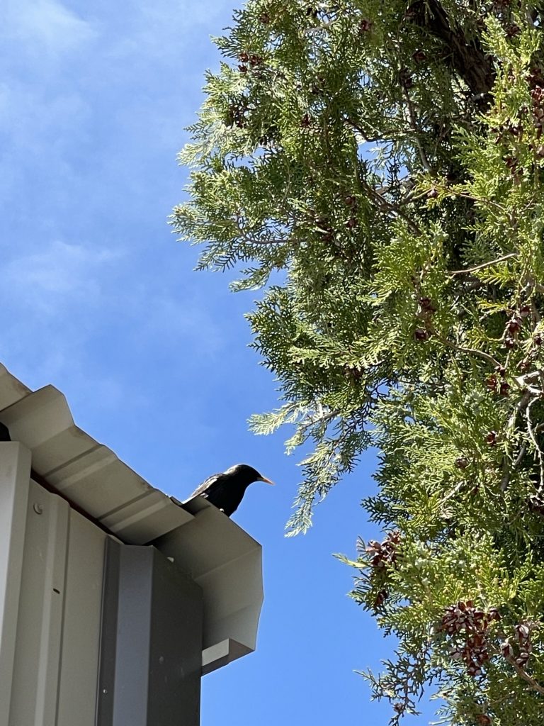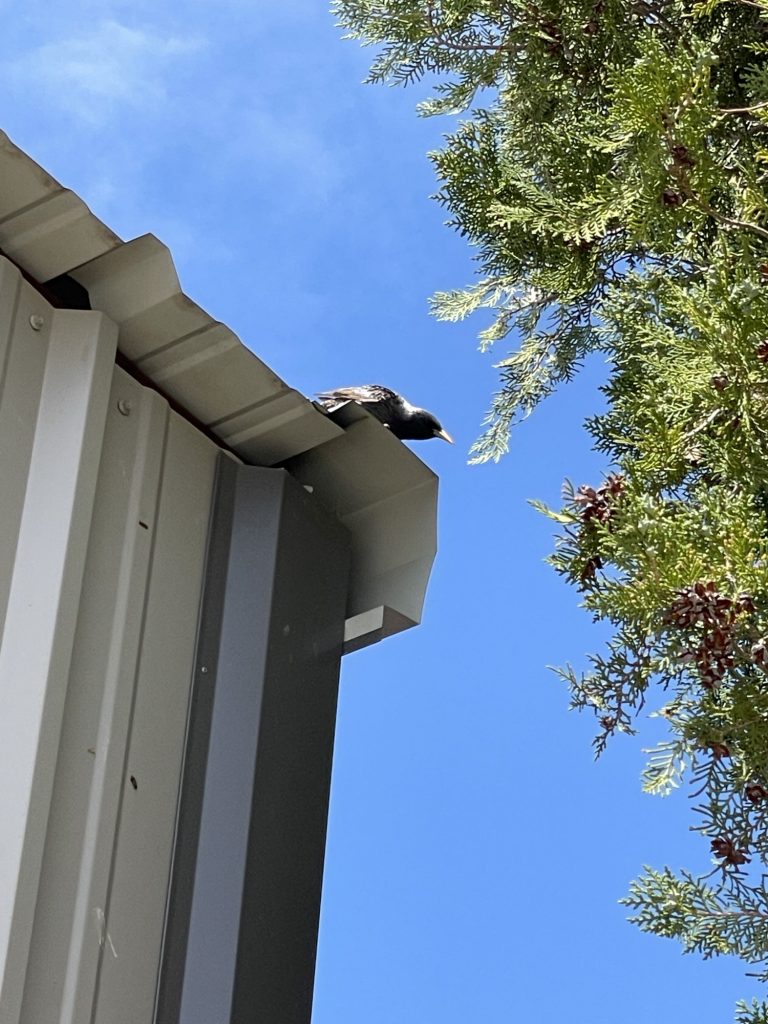 Last year there was a speckled Black bird in my neighbors roof of their shop. I am finally seeing another one now. In the last picture it looks like he/she is coughing and it’s spraying liquid out of its mouth. It looks like the liquid is spreading into two different trails. Maybe it has something to do with it marking its territory? I just happened to take the picture right then.