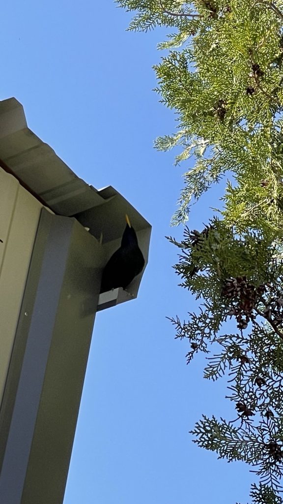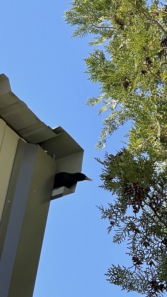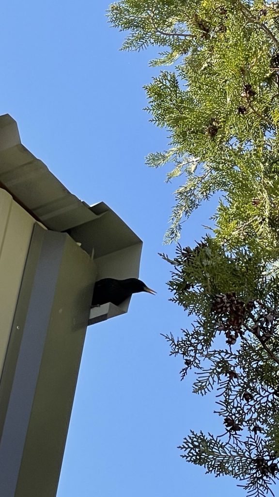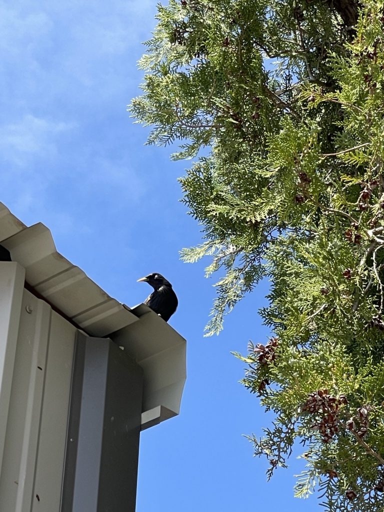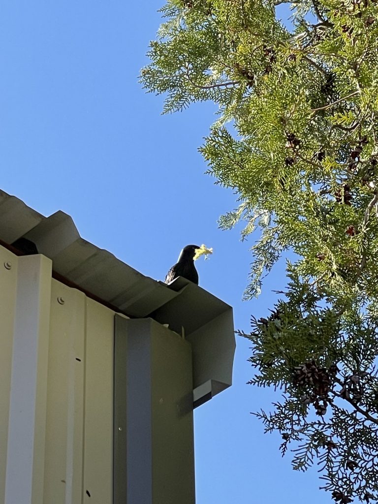 Last year there was a speckled Black bird in my neighbors roof of their shop. I am finally seeing another one now. In the last picture it looks like he/she is coughing and it’s spraying liquid out of its mouth. It looks like the liquid is spreading into two different trails. Maybe it has something to do with it marking its territory? I just happened to take the picture right then.