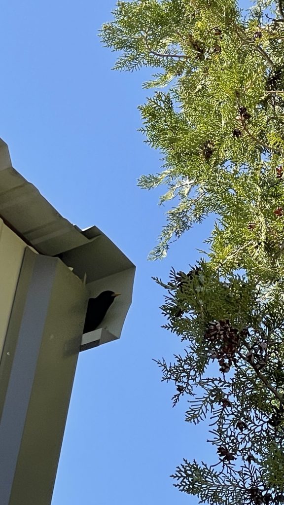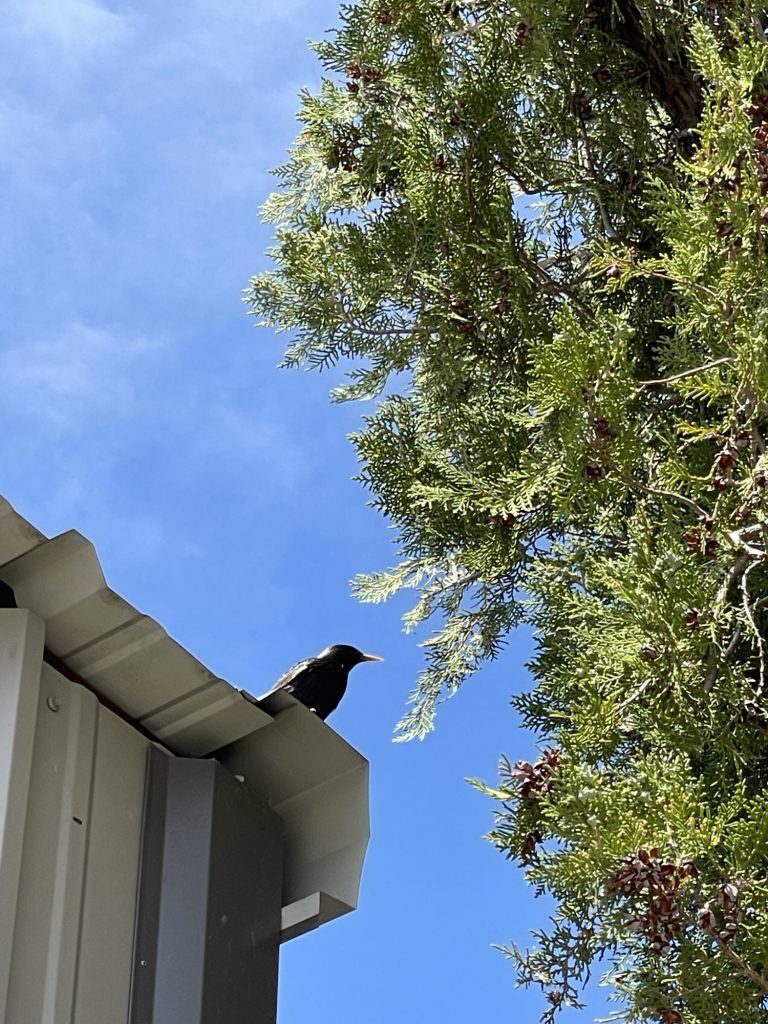Here is the speckled blackbird from last year around the same in March. This is where it nested. This is my tree but my neighbors shop. I think this year one will be in the same place because I have seen one fly in.