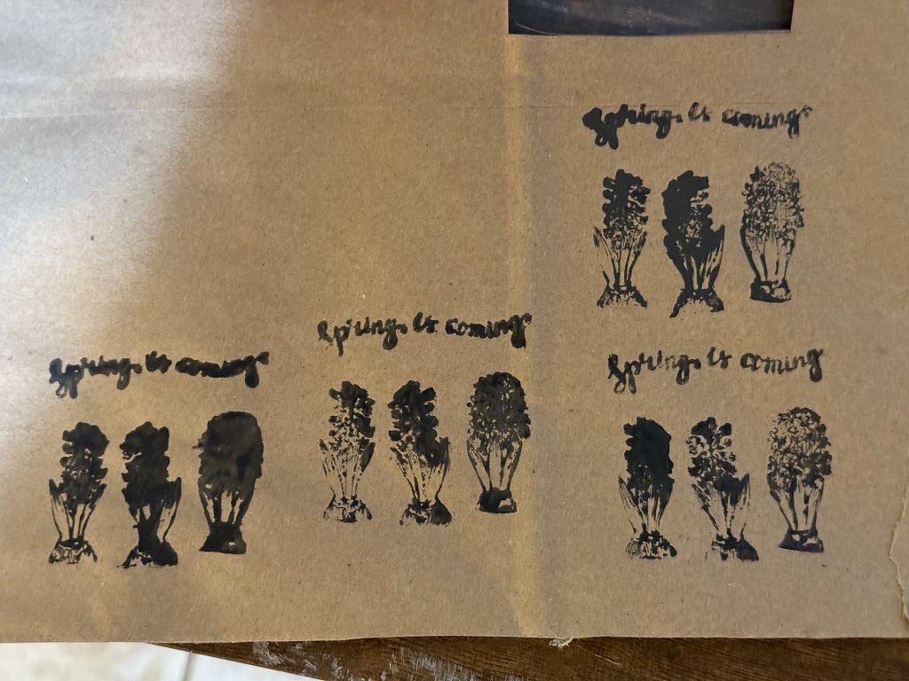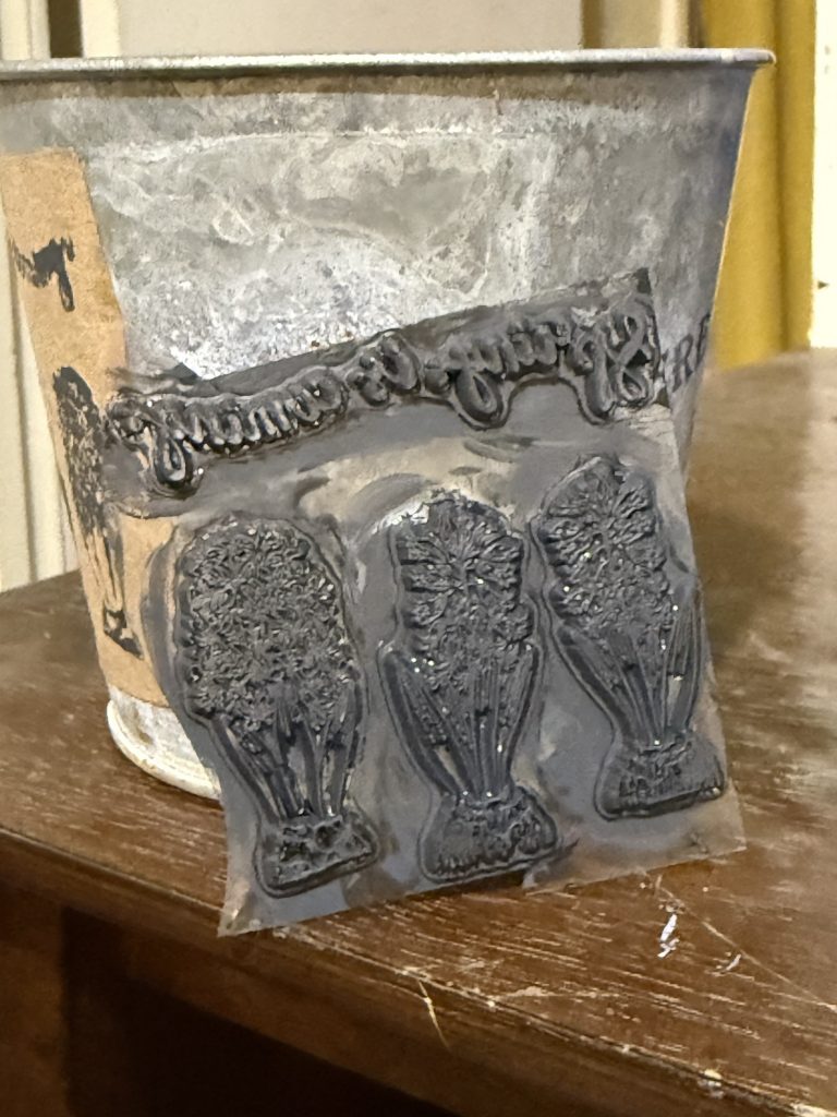I used these stamps and painted them with craft paint and used a paper bag and stamped it, then I glued it on this tin decor.