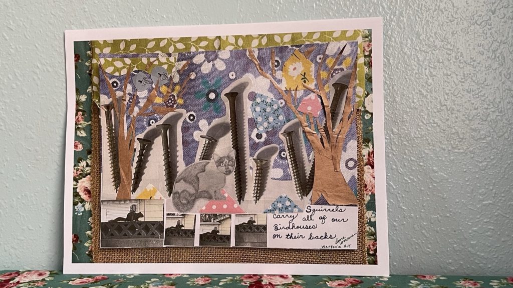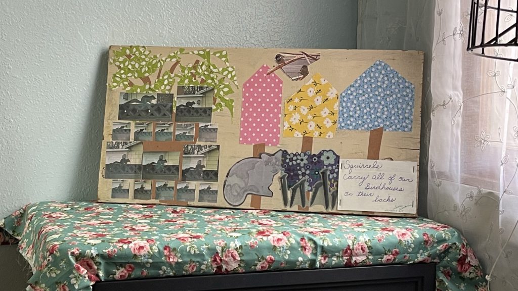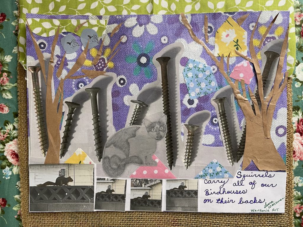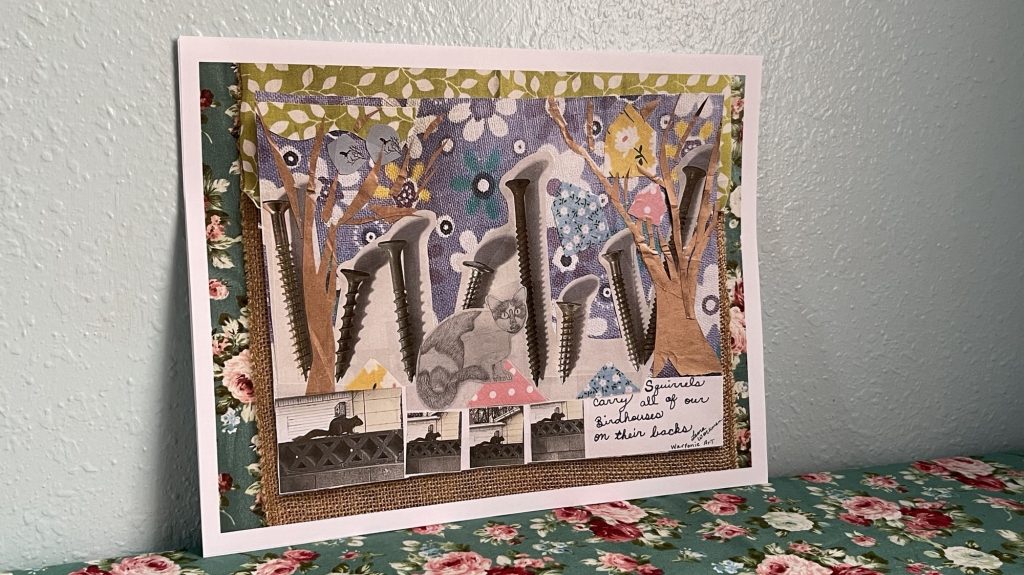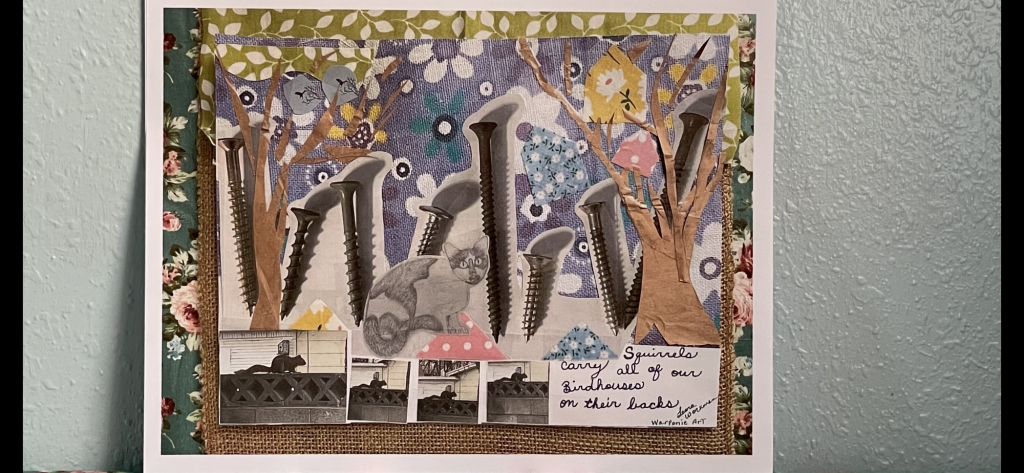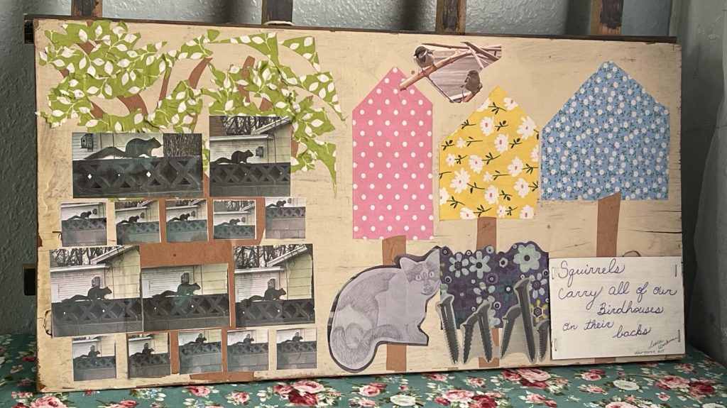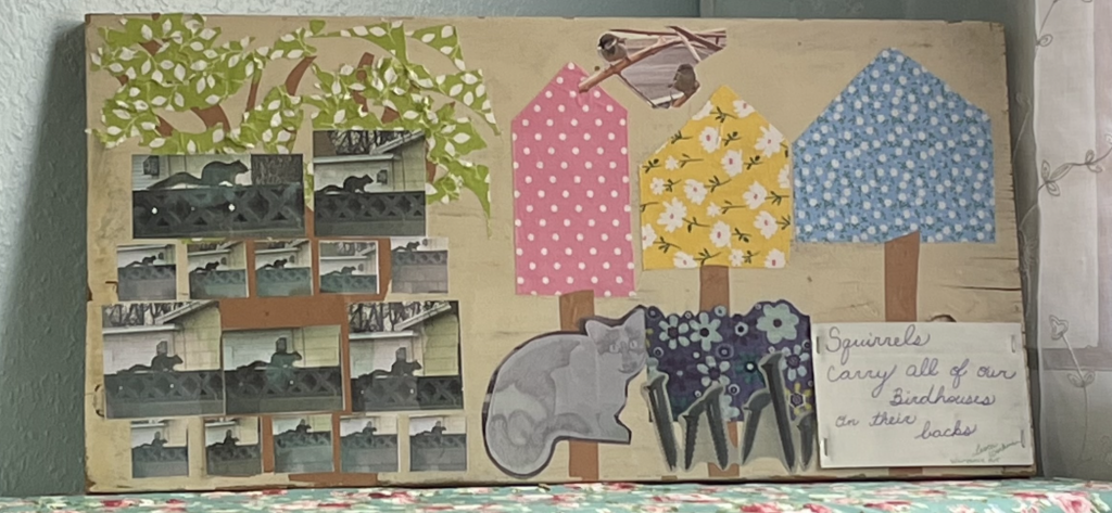 Here are the pictures that I used for the wooden collage and the print. I also used fabric for the birdhouses. I think Jesus liked all animals and maybe he trained squirrels just to have fun. Maybe they were in the town and the religious leaders didn’t like them so Jesus gave them a job so that the squirrels could live and not be considered pests who needed water. This is only a theory and I am just making it up.