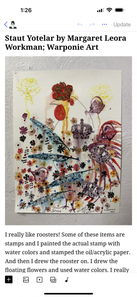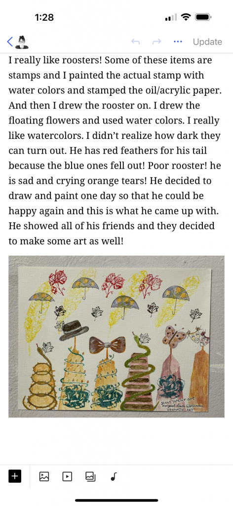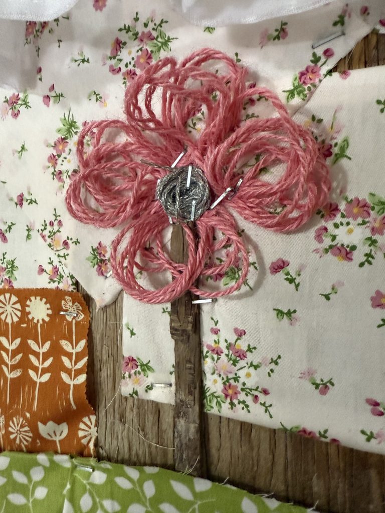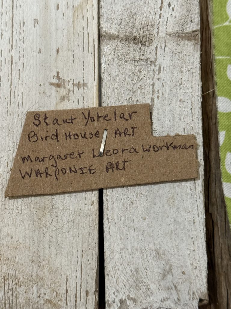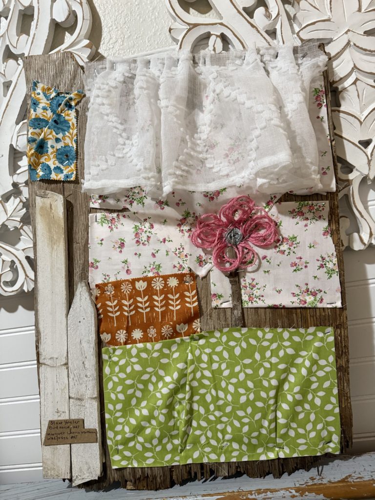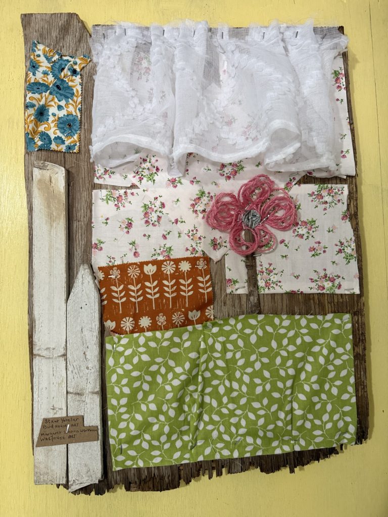 I stapled fabric to a piece of plywood and used school glue for the fence posts. I could have used hot glue but I didn’t want to wait for the gun to heat up. It symbolizes how Staut Yotelar, the rooster, sees the bird houses that are next to the farm house in the barnyard where he lives.