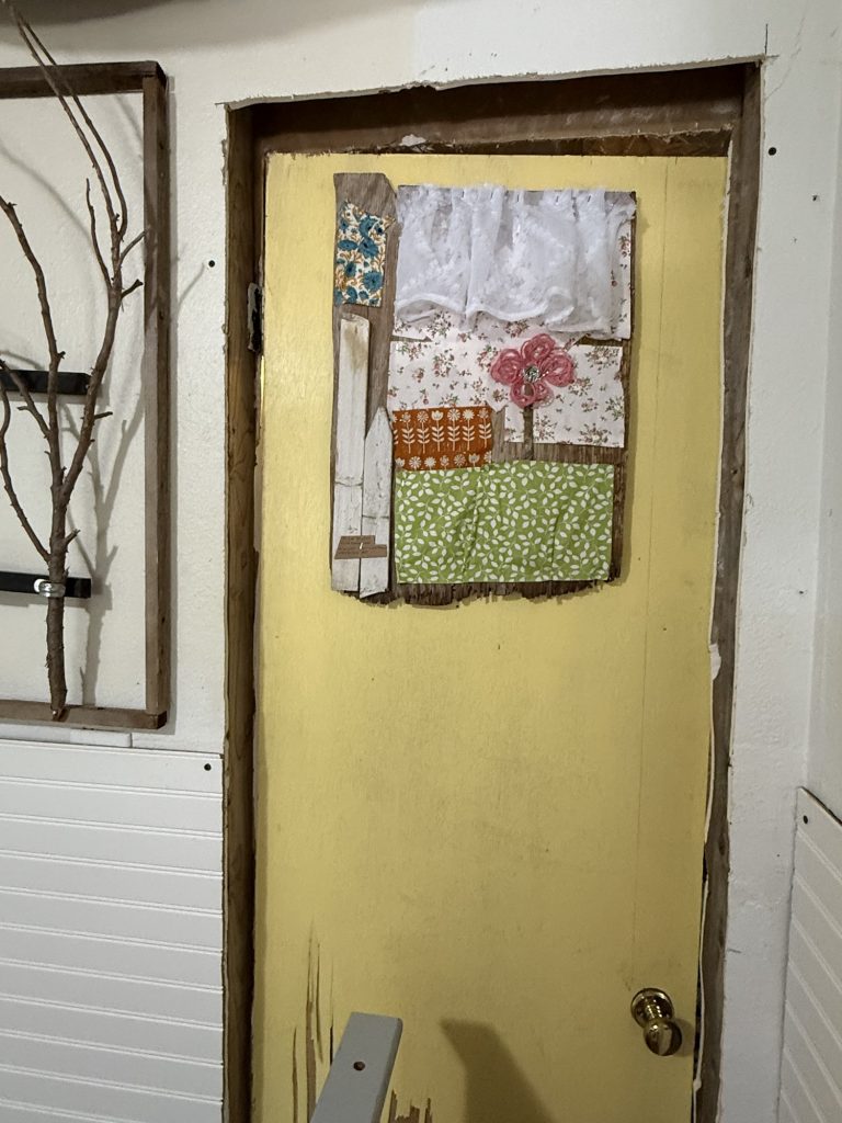 I screwed it to the door instead of creating a hanger on the back. That way it doesn’t move when I open the door. I liked how the yellow looks in contrast with this art.