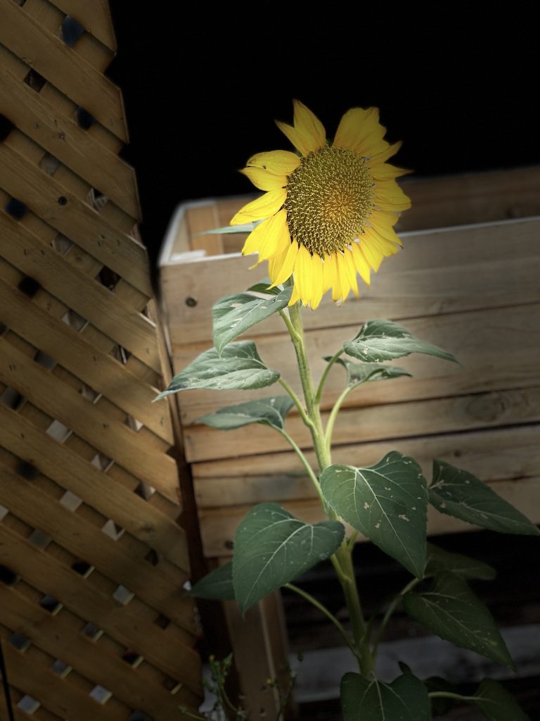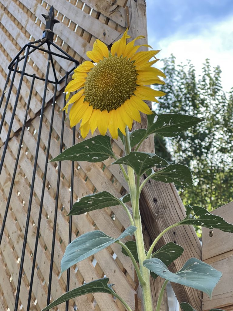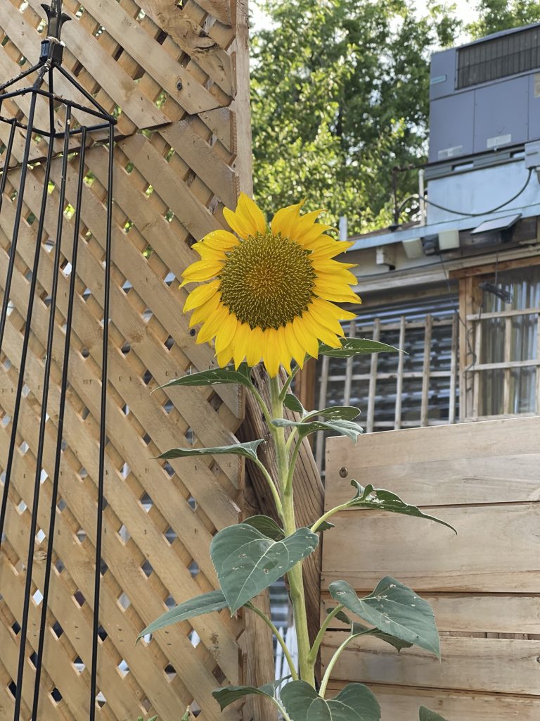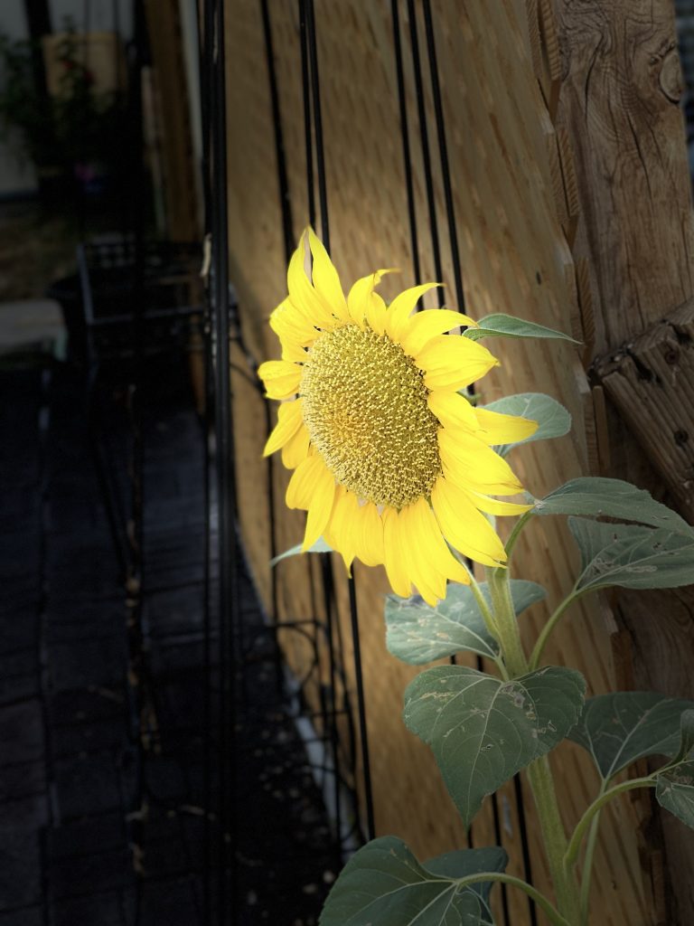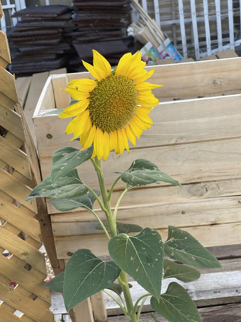 This is the sunflower that came up this summer unexpectedly in my yard. I feed the doves and other birds chicken feed and birdseed and that has sunflower seeds. I also have a few mice that eat all of that and so these seeds get carried along….