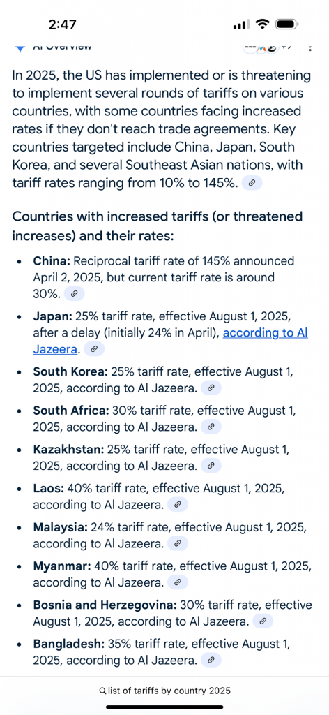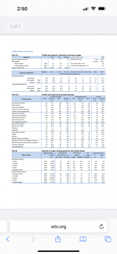 I thought with all of the news about tariffs that there would be more. I decided to look up the tariffs by country and by item or category. The first pic is according to the AI general information, and the second one according to the ‘World Trade Organization’. I was wondering about this for myself so I thought I would post it here. I was wondering about items like; sugar, and flour and coffee. I do see them on here and the tariff seems low, or do they seem high? The number listed is a percentage correct? Also, for each country that the sugar, coffee and flour goes through what tariffs do they add on? And is flour listed under agricultural products?? Because it’s made from wheat.