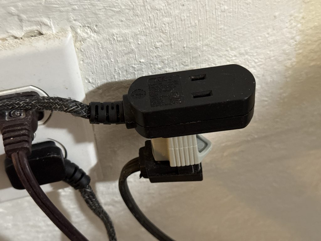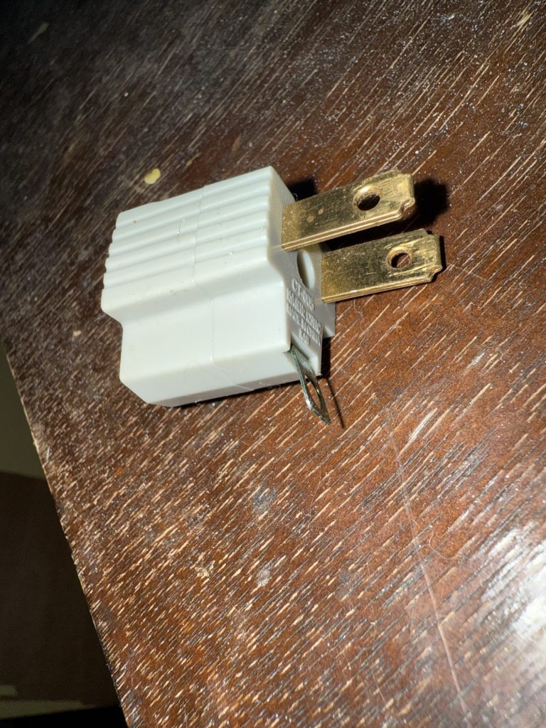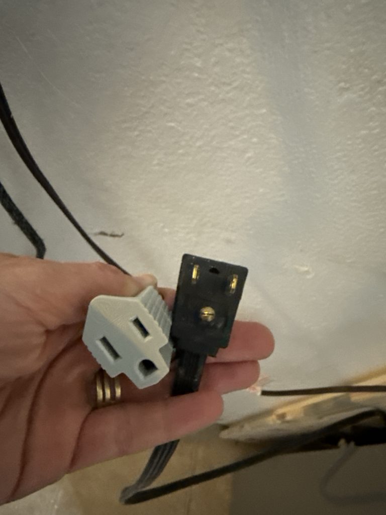 See how it’s two pronged in one side and three holes in the other side. This is my fridge. I moved it and the cord is not long enough to be plugged in at the nearest outlet. Extension cords are fine! Extension cords have different ratings and gauges (gage). There are small ones and very large heavy duty ones. If you have something like a portable air conditioner that uses a lot of watts, BTU’s and amps..look on the side of the box or google the item to see how many that item uses. Then google what type of extension cords and their gauge that would be needed for that wattage and BTU and amperage for it to run properly. Lawnmowers, space heaters, portable air conditioners, etc. will need a higher rating or gauge for extension cords. Sometimes they do not carry them at Walmart and you will have to buy them at Amazon or Walmart.com (online), or at a hardware store.