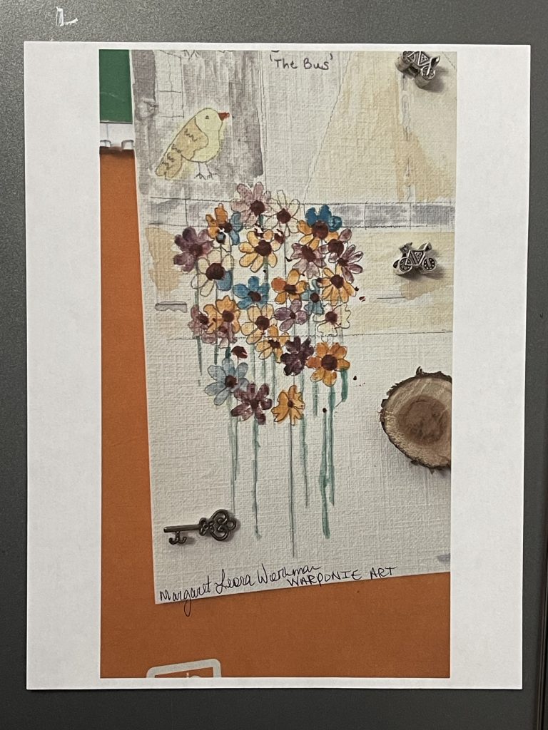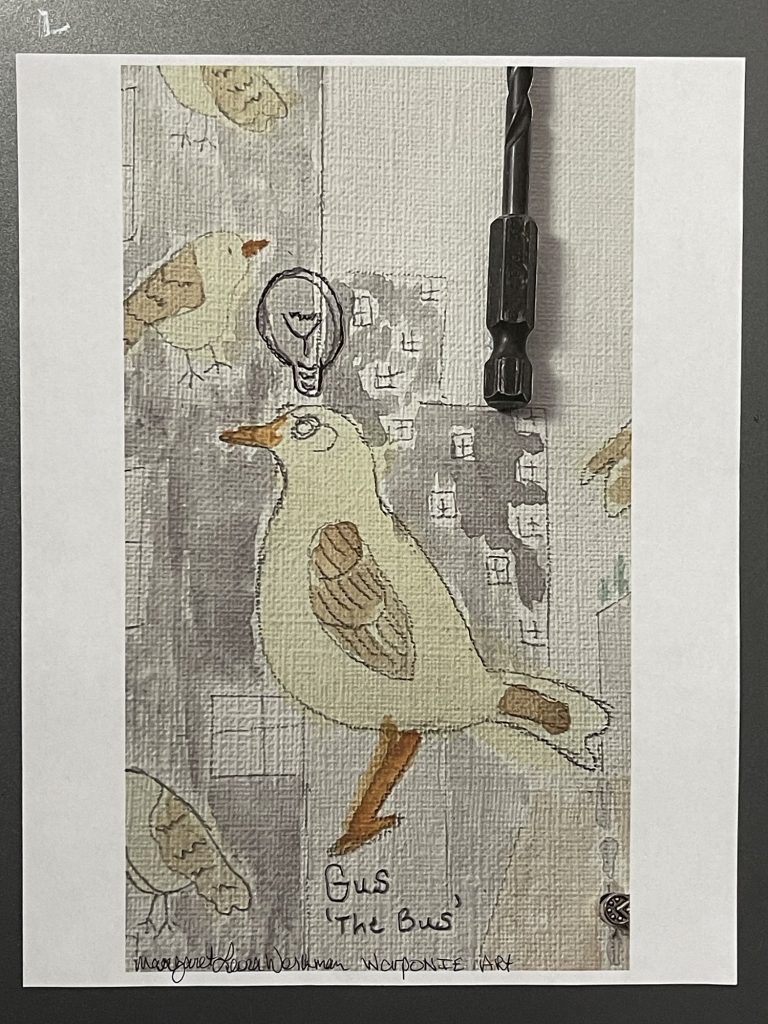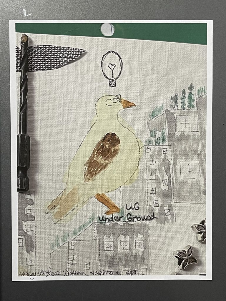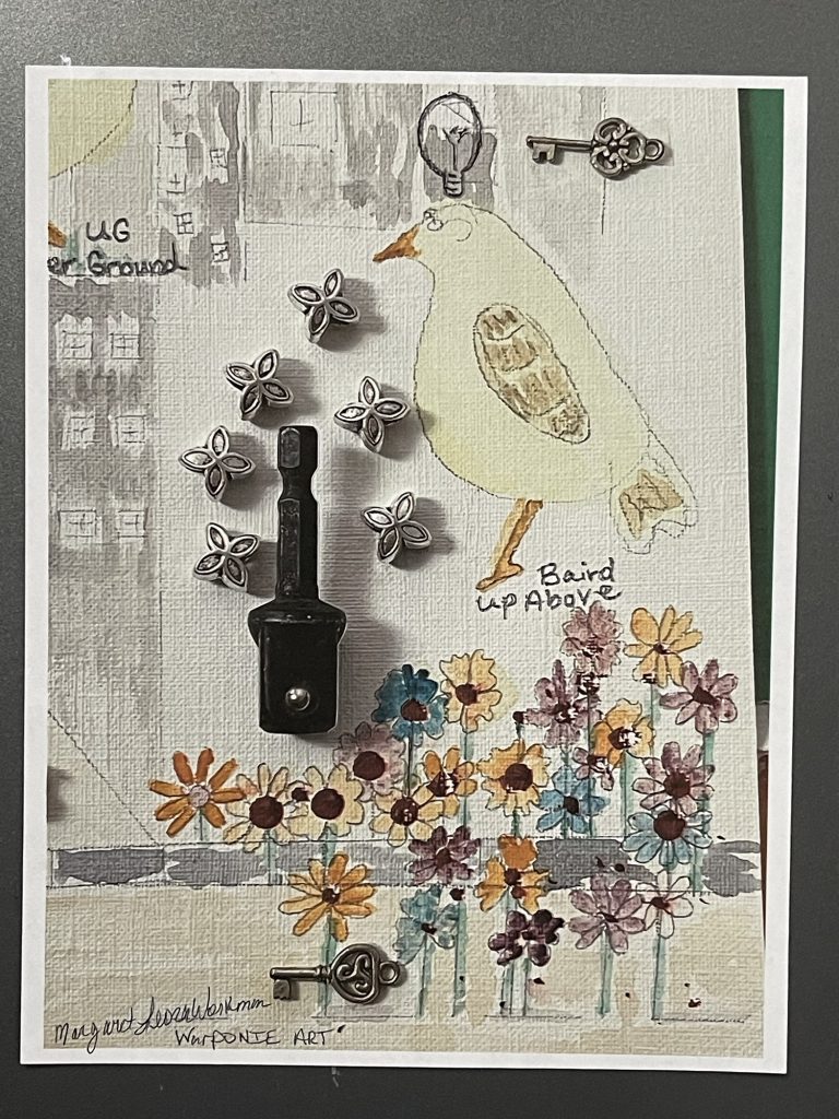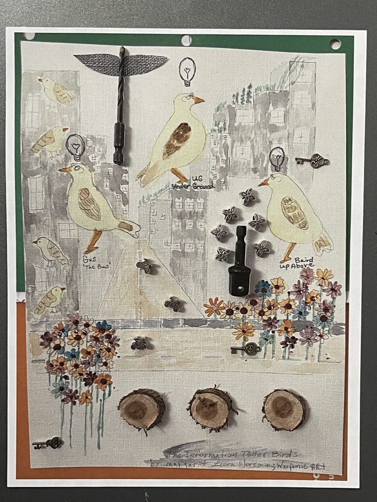 I printed out the first one and it looks purple because one of my printers is running out of ink so I used my other one. I was thinking about the subject of sustainable living when I finished this picture. I had drawn the birds and some of the buildings already so I just added the other things today. I already had these beads and I thought it would be fun to add random things that I had laying around as well. I found the drill bit that is supposed to be a water fountain that is in front of Baird the bird in a grocery store parking lot. Sorry to whomever dropped it and went back to find it, finders keepers…. I am not heartless most of the time! They could have found me because it’s a small town. But that would have been creepy. Anyway, for the small tree stumps I had cut those off of my tree limbs that I had trimmed off of my own tree. I thought they were so cute! The drill bit I used recently and never put back, it was randomly lying around. I am not a hoarder, I am just dis-organized because it’s the law of entropy. Right? You know when you clean and then this law of physics says it will eventually unravel without your control into disorganization. Anyway this is how it is. The lips in the sky is supposed to be one of those planes modeled after the Hindenburg. I had a random eye that I had cut out but my fan blew it into the lost area of invisibleness. That is where the other one went as well so I was stuck with the lips. I hid the middle under the drill bit so you can’t tell. So birds know everything I guess. Didn’t they train those pigeons to carry messages during WWI or WWII? They called them ‘carrier pigeons’. I believe they lost their job because of morris code or the internet so they became sustainable living birds with a very small footprint as they don’t use smart phones and they ride their bikes and wear helmets. They always come up with ideas and that’s why they have lightbulbs over their heads!