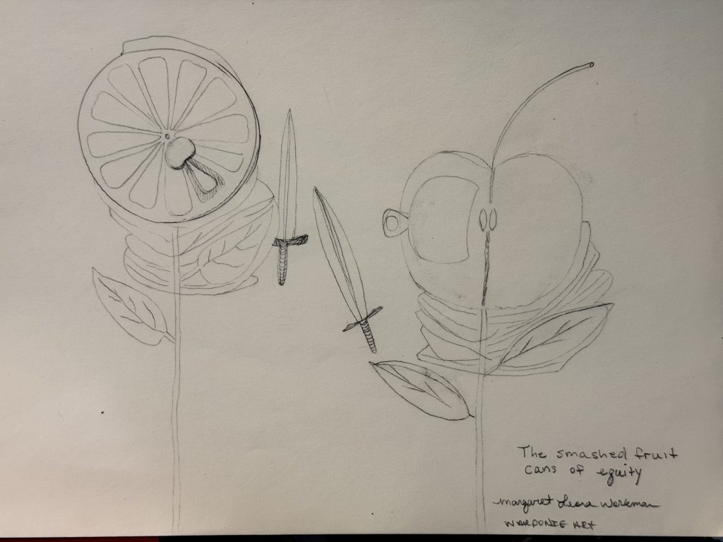 I woke up one morning and saw lemons with flower stems in my curtains. Sometime the sun shines through my curtains in the mornings. Then I was thinking of apples and lemons sword fighting. Which one wins? I want the lemons to win, they don’t get enough credit because they are so sour. Sour words sometimes are needed more than sweet ones. To me caustic and sour are different. No one likes caustic words but sour ones always have a hint of sweetness and beauty, just like lemons.