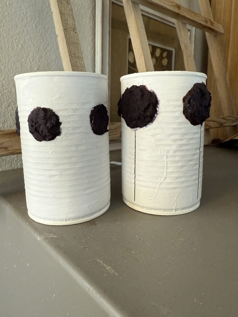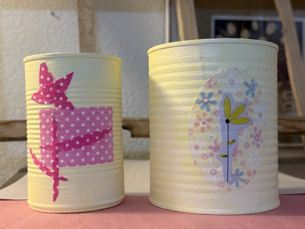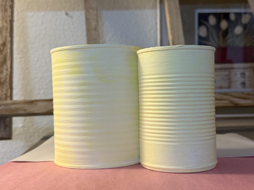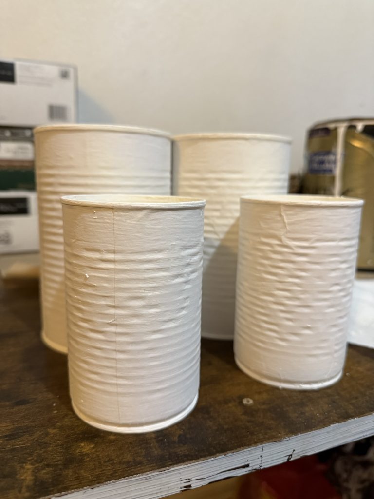 The one on the left has no paper and the one on the right has copy paper decoupaged on. I used latex paint on one and craft paint on the other for the top layer on the paper along with the decoupage. it made no difference. But the first layer has to be the latex so that it doesn’t scratch off of the can. If you use craft paint on top then you can use different colors of craft paint with the glue and water so that it’s see-through. You don’t have to do it this way.