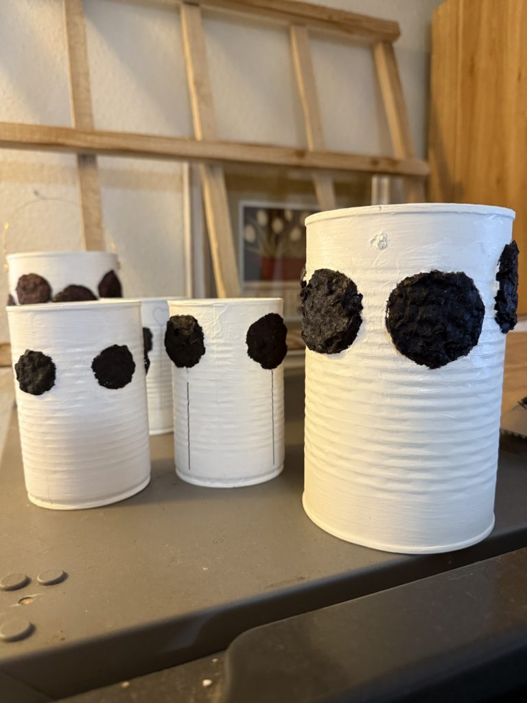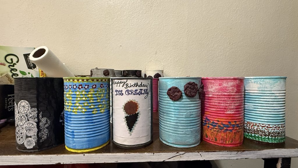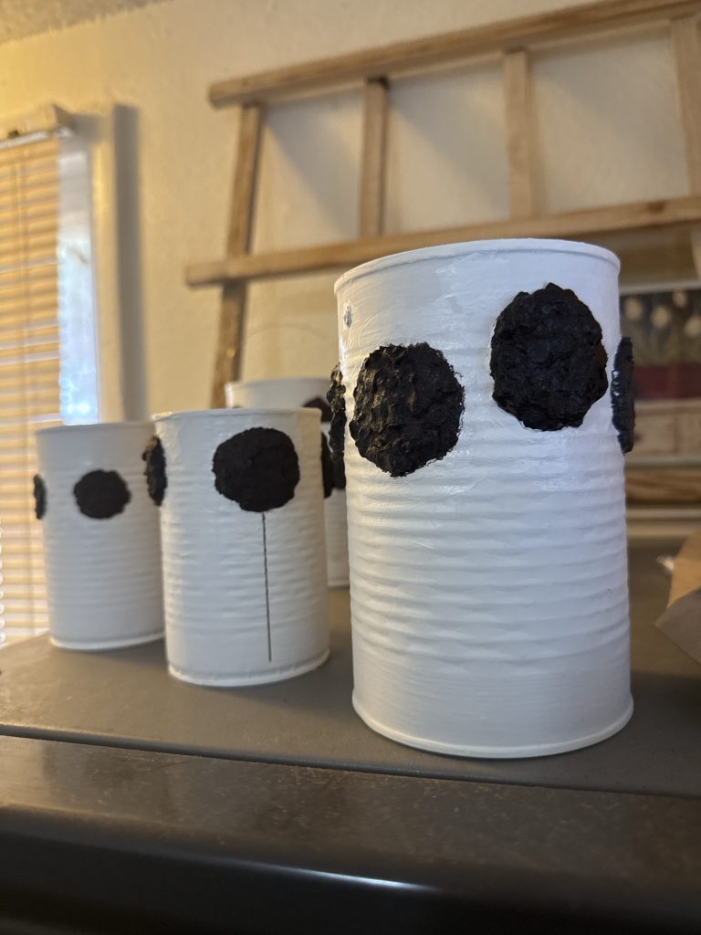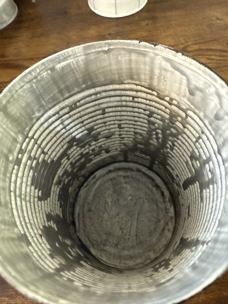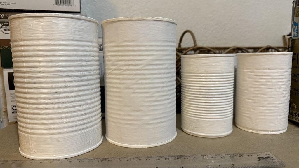 The one on the left has no paper and the one on the right has copy paper decoupaged on. I used latex paint on one and craft paint on the other for the top layer on the paper along with the decoupage. it made no difference. But the first layer has to be the latex so that it doesn’t scratch off of the can. If you use craft paint on top then you can use different colors of craft paint with the glue and water so that it’s see-through. You don’t have to do it this way.