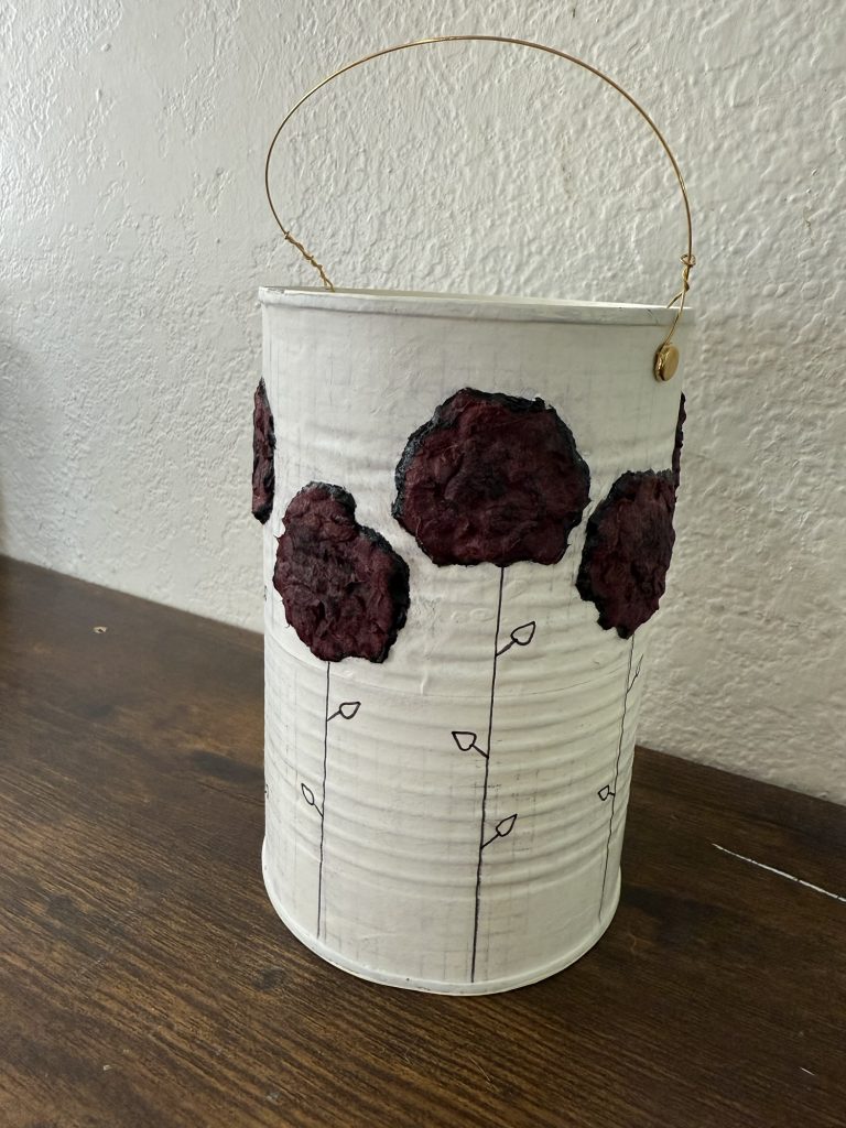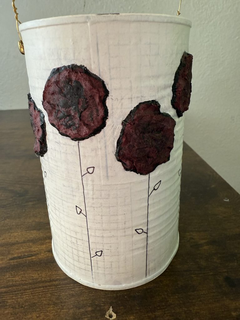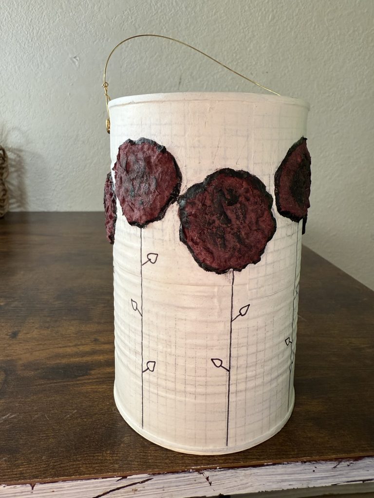 This was bought from me on eBay today, so excited! It was fun to make. I used a large can of sweet potatoes and latex paint. Homemade decoupage and construction paper for the flowers. First blend the construction paper in a blender. Add that to glue and water. Measure the mixture with a tablespoon and Pile it on, then use a hair dryer to dry each one. First, cover the can with decoupage and cover with paper, any paper that you want. Paint that with paint plus decoupage because it makes the paint clear, like a stain. That allows you to draw on it.