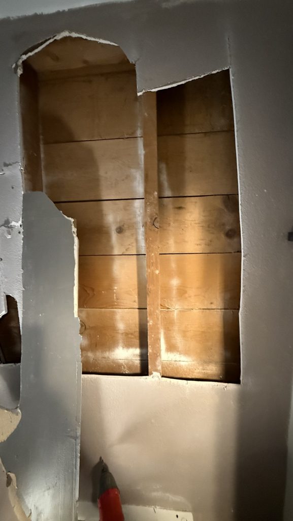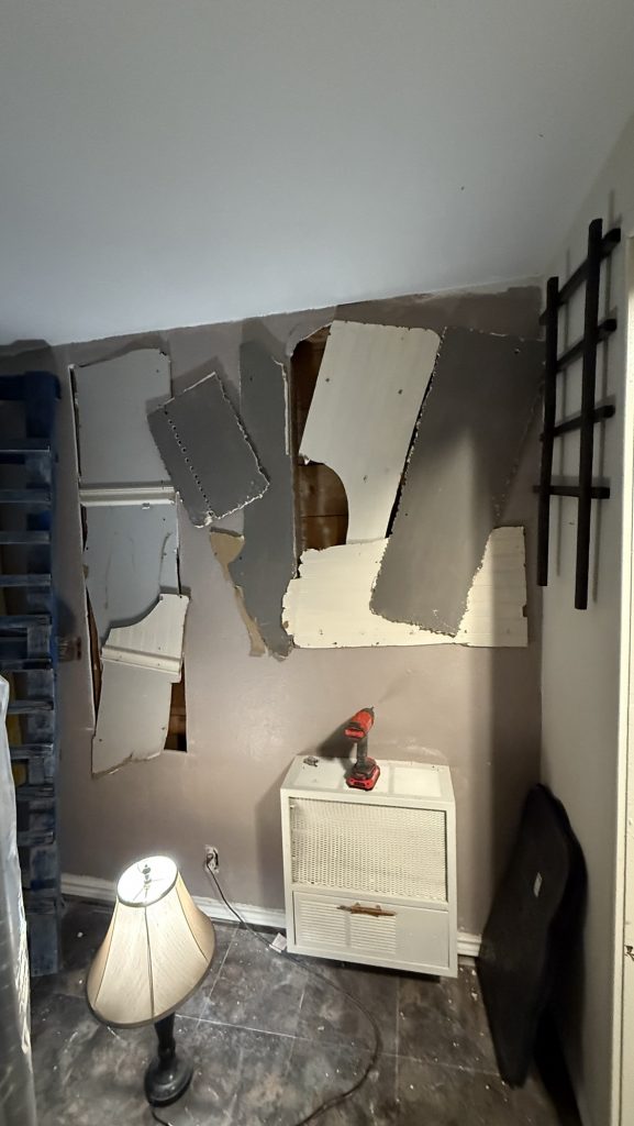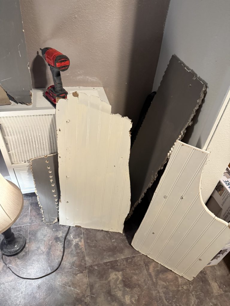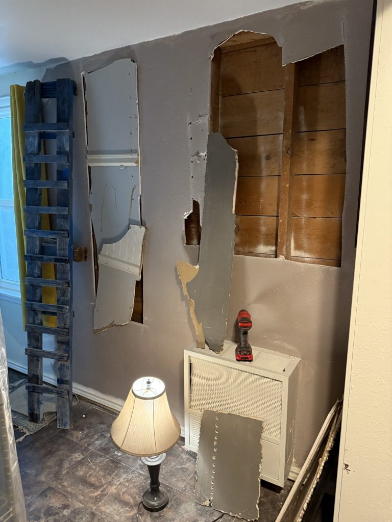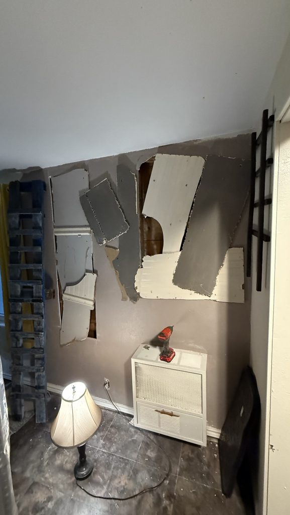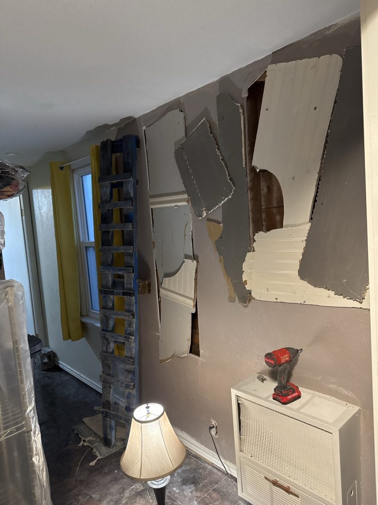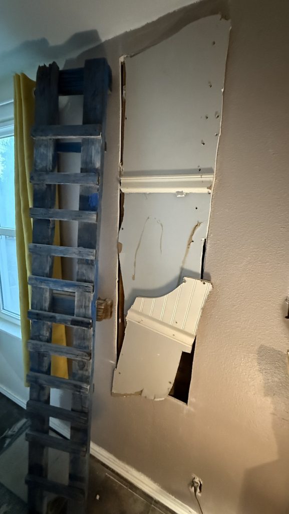 Remember the opening in the bathroom that I made? These parts are from that part of the wall that was the wall to the bedroom closet on the other side. I would like to remove all of the drywall in here which is the living room because of the nice shiplap that is behind it. For right now I am putting the pieces from the other wall up as wall decor on this living room wall. I painted this old pretend ladder blue and white.