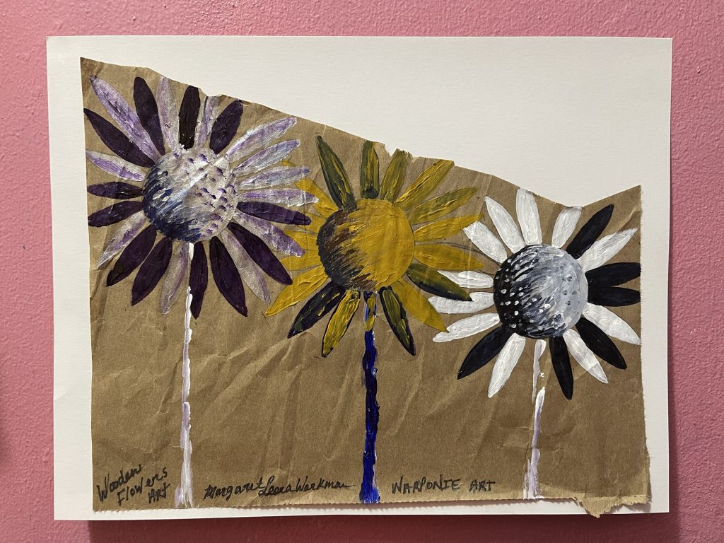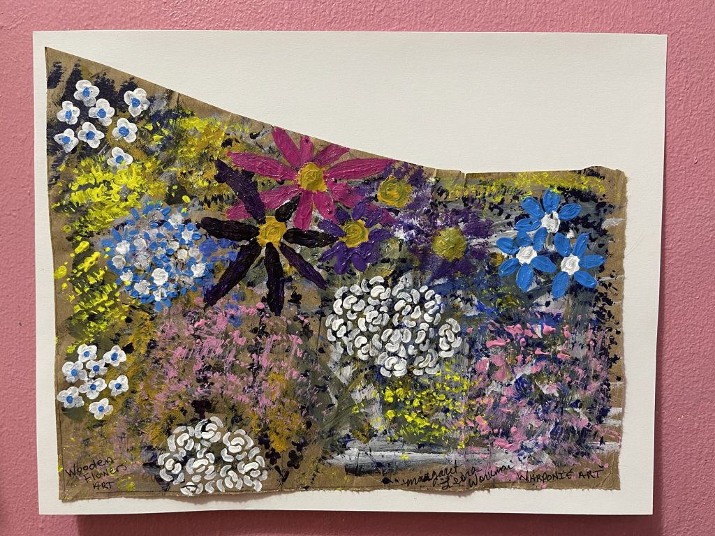 For this art by wooden flowers I just painted flowers onto the brown paper that I got from a package that I bought online. I save all of that. Do you remember that show called ‘hoarders’? Please let that not be me. I keep it in a box on a shelf, not on the floor where I could accidentally step on the eggs that supposedly thrown away last month. I always cleaned my house, and organized closets and donated everything I owned after watching one episode.