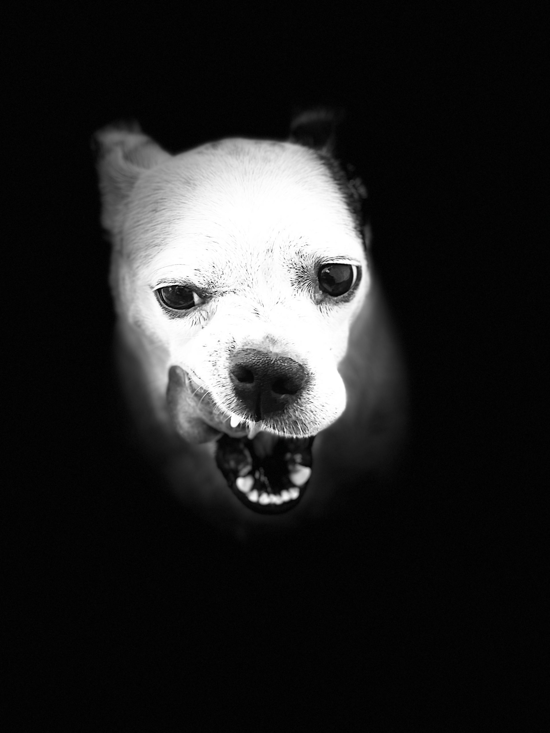 this picture is of my dog Mudge thinking about this chicken in front of her.