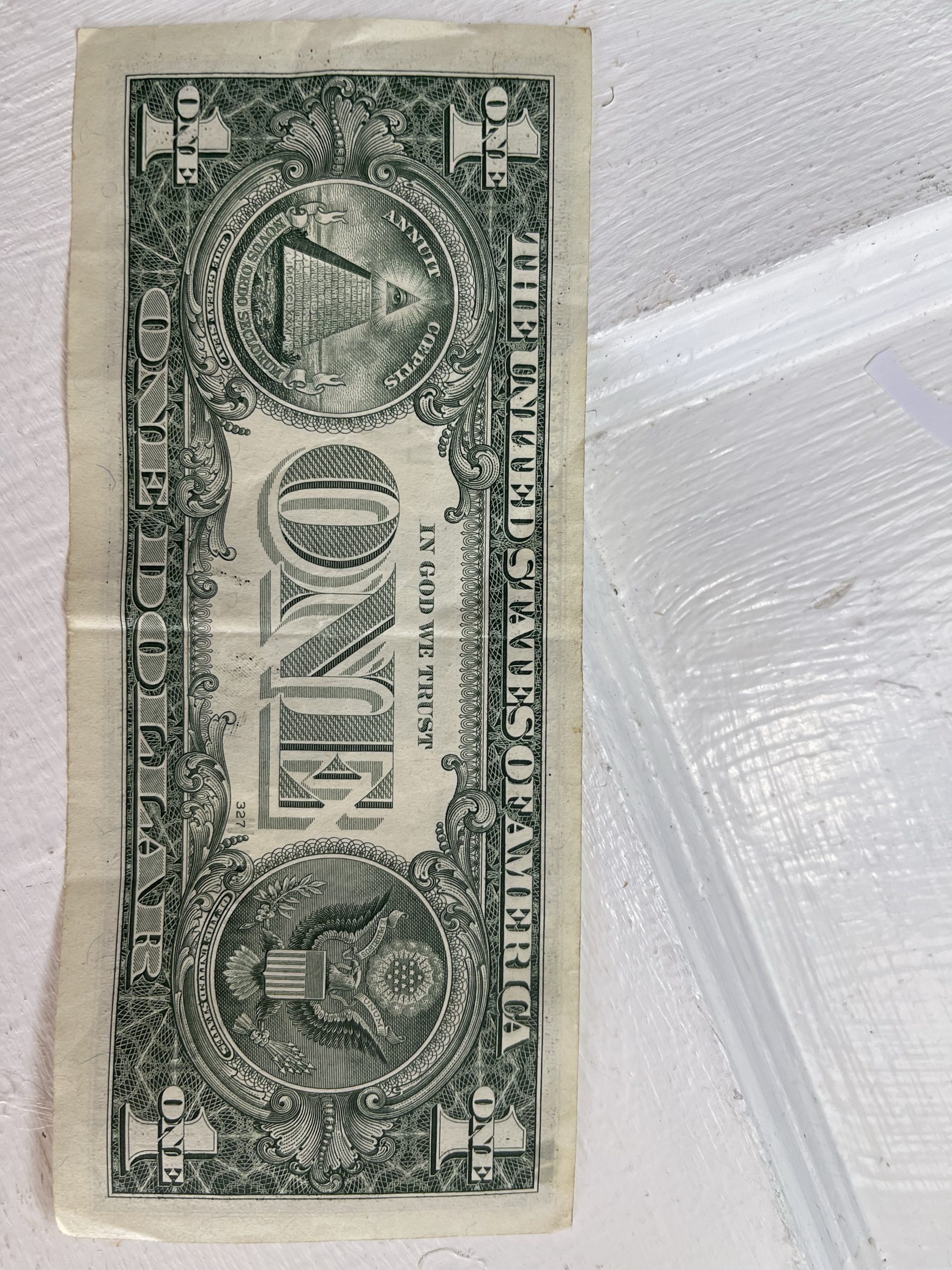 Did anyone look? I just happened to have a dollar bill and it’s on the ribbon above the Eagle!